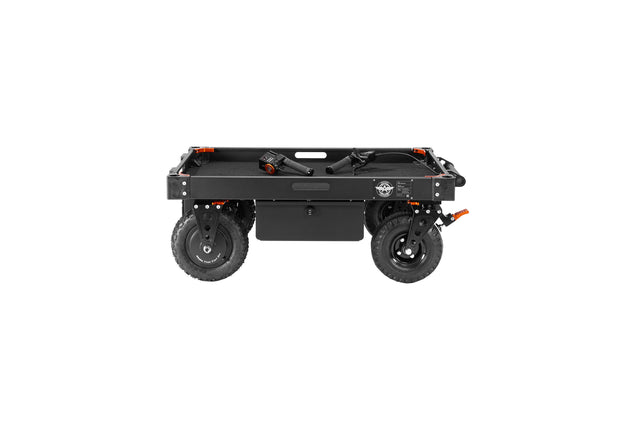 The handle throttle assembly powers forward and reverse movement of the dual 10 in. rear wheels, for up to 15 hours or 40 miles of full throttle use. The power supply is integrated into the bottom shelf drawer and provides additional power distribution when charging to USB-A, USB-C and US Type B outlets.
