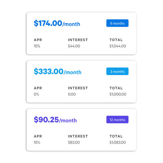 Pick the payment plan you like best—monthly payments over 6, 12, or 36 months. You’ll never pay more than you agree to up front. See footer for details.